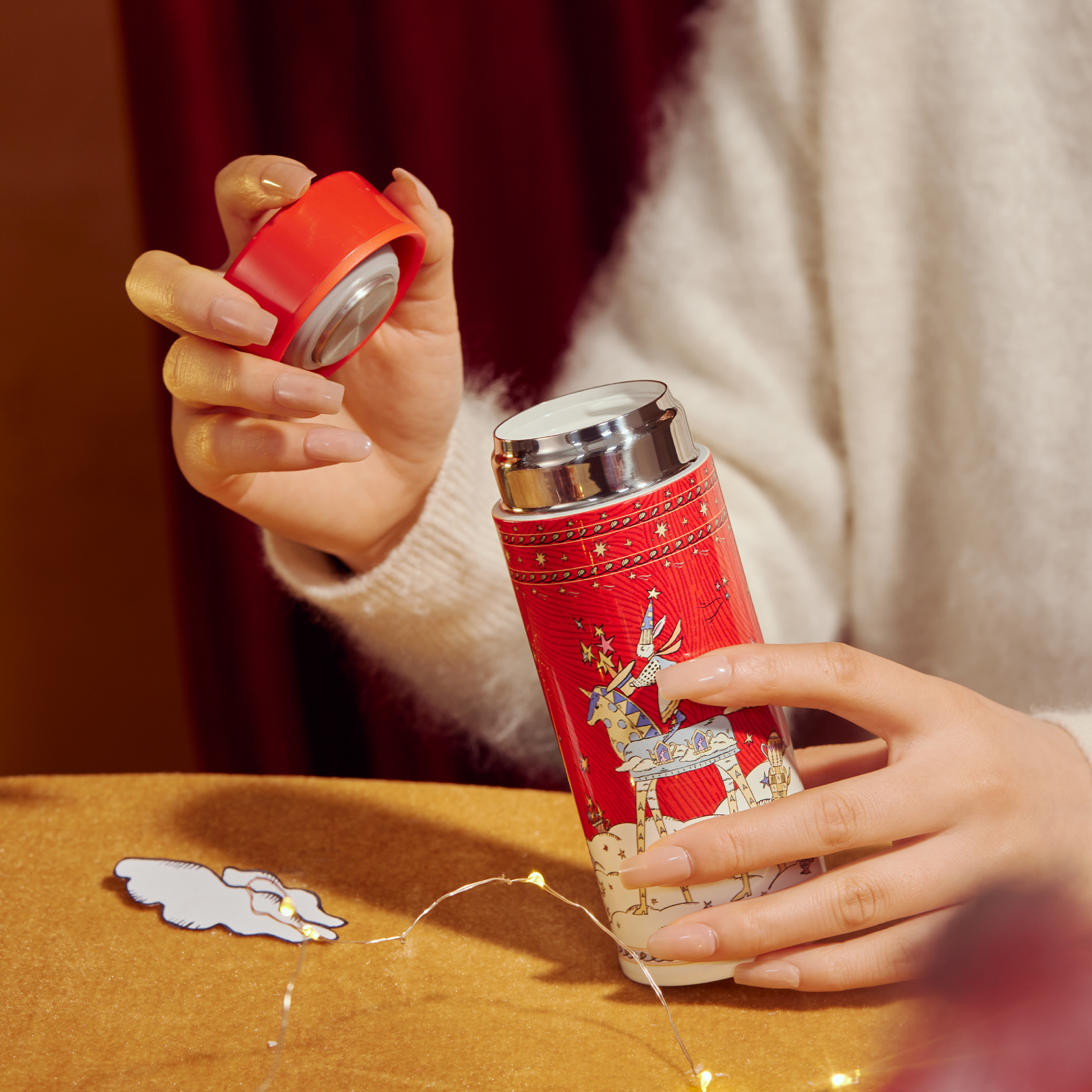 Inspired by the festive red of the New Year, the BlanBunny Dream Circus Mini Insulated Bottle unfolds a whimsical circus scene where joyful horses roam freely and star magicians conjure moments of luck and wonder.