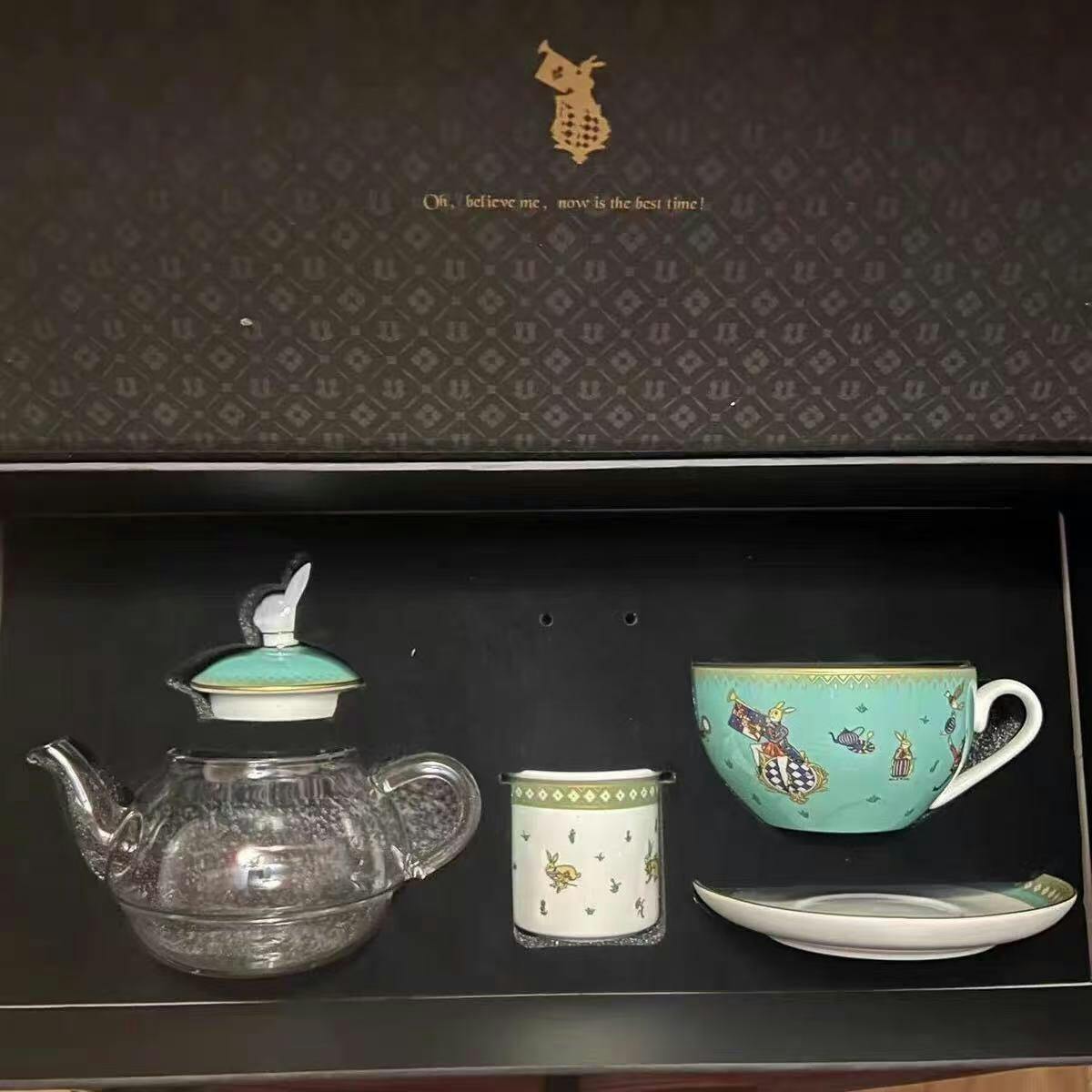 - 1 glass pot, 1 built-in tea strainer, 1 set of cups and saucers, 1 commemorative brooch.